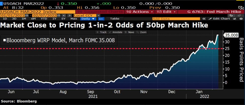 Los mercados ya casi descuentan que la subida de tipos de marzo de la Fed será de 50pb y no de 25pb, las probabilidades están al 50%.