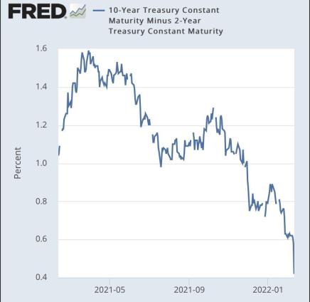 El diferencial de rendimiento de 10 años frente a 2 años está a solo 40 bips (0,40 %) de la inversión, lo que indica que los mercados de bonos esperan un crecimiento más lento y una deflación más adelante 👇🏻