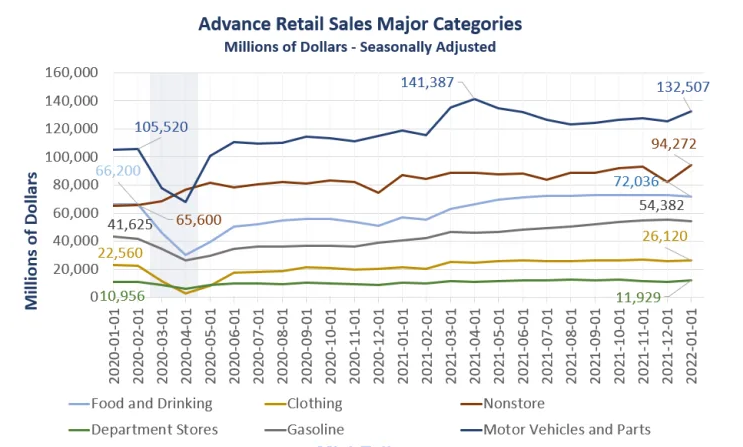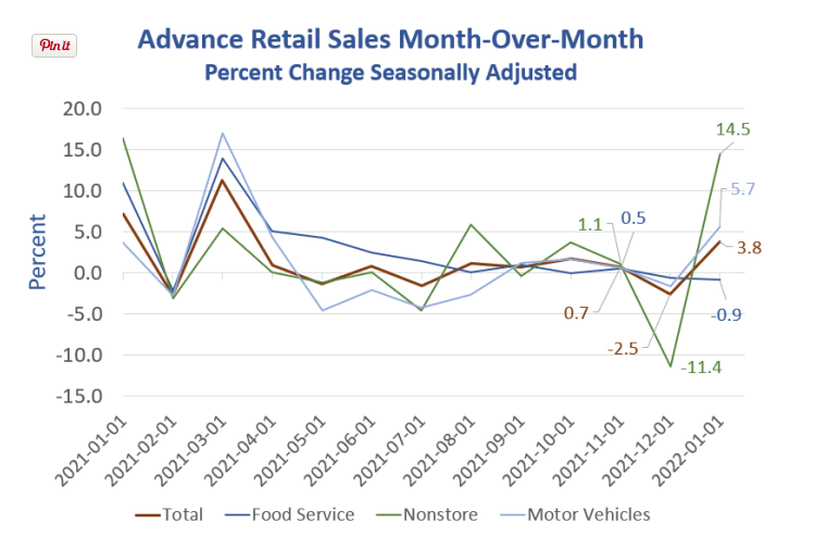 Las ventas minoristas aumentaron con fuerza en enero. Aumentaron un 3,8 %. Un punto clave, que a menudo se pasa por alto, es que las ventas no se ajustan a la inflación.
