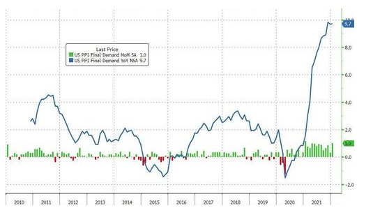 En enero, los precios al productor de EE. UU. aumentaron un 1,0 % intermensual (el doble del salto esperado del 0,5 %) y es el vigésimo primer mes consecutivo de aumento intermensual. Esto hizo que los precios subieran un 9,7 % interanual (máximos récord y muy por encima del esperado +9,1 % interanual)