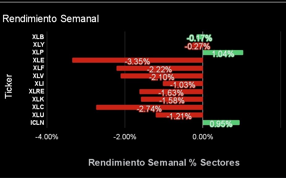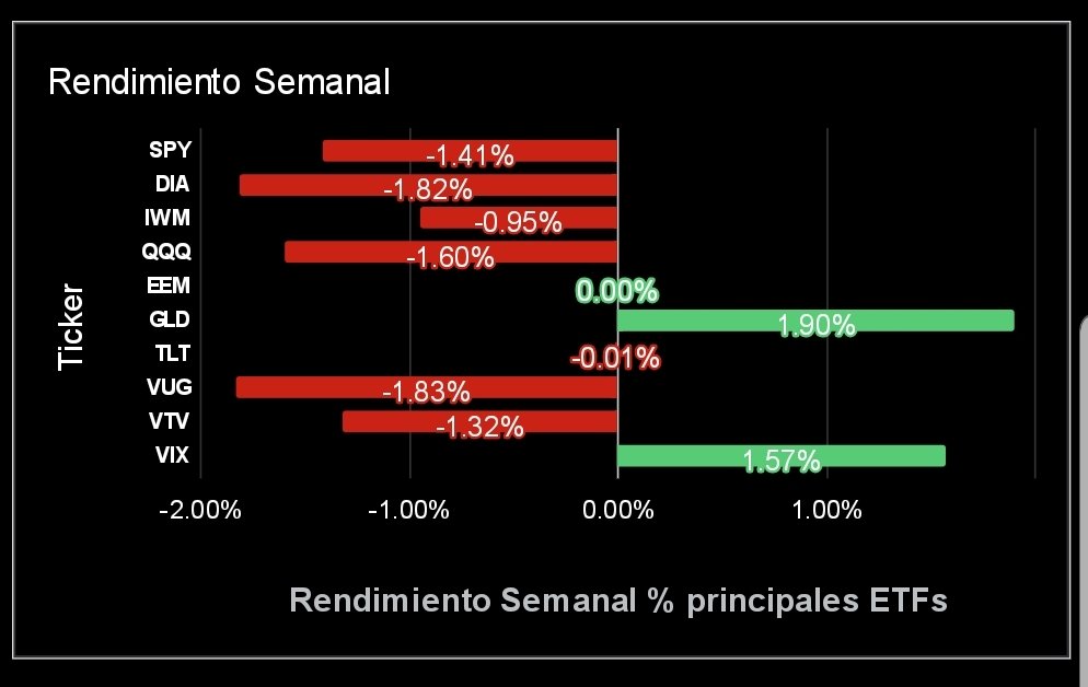 Rendimiento de la semana de los principales etf y sectores, el oro tras las noticias de Rusia ha subido casi el 2%, todos los indices cerraron negativos.