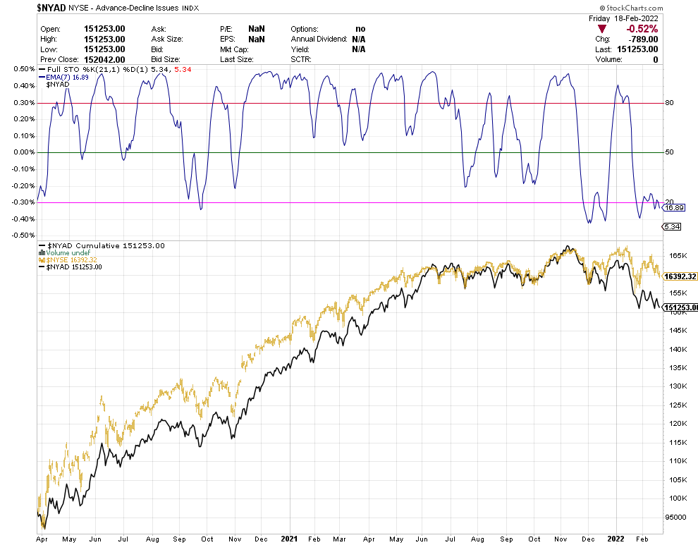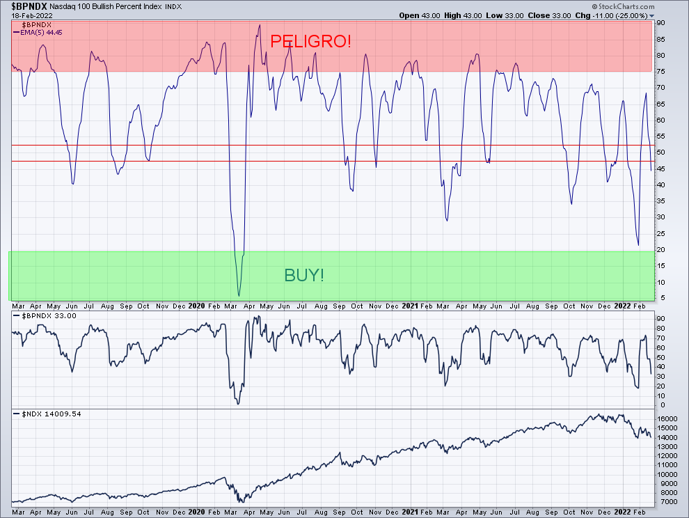 Hemos llegado y roto a la baja la zona neutral del bullish percent del nasdaq 100 en su media de 5 periodos simple. Si el indicador se da la vuelta podría comenzar a generar mínimos mas altos.