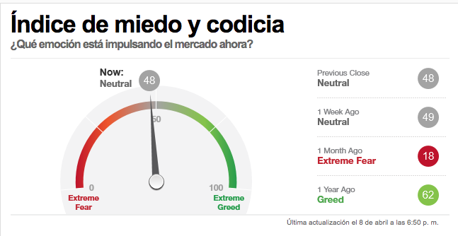 El indicador de miedo y codicia en CNN actualmente en neutral, el indicador de Bank Of America el famoso Bull and Bear en 2.1 pasando de señal de compra de la semana pasada a neutral.
