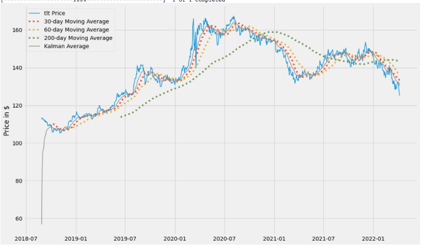 El rendimiento a 10 años ha tenido un aumento de 5 semanas mas grande en más de una década. Lo cual nos indica la sobreventa que existe en algunos etf de bonos como el etf, a continuación muestro el TLT con el filtro kalman.