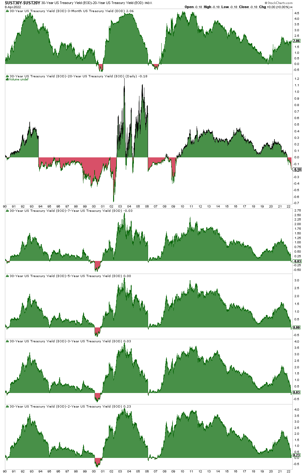 Vamos a comenzar con los rendimientos de 30 años y sus spread en comparación. Actualmente están invertidas