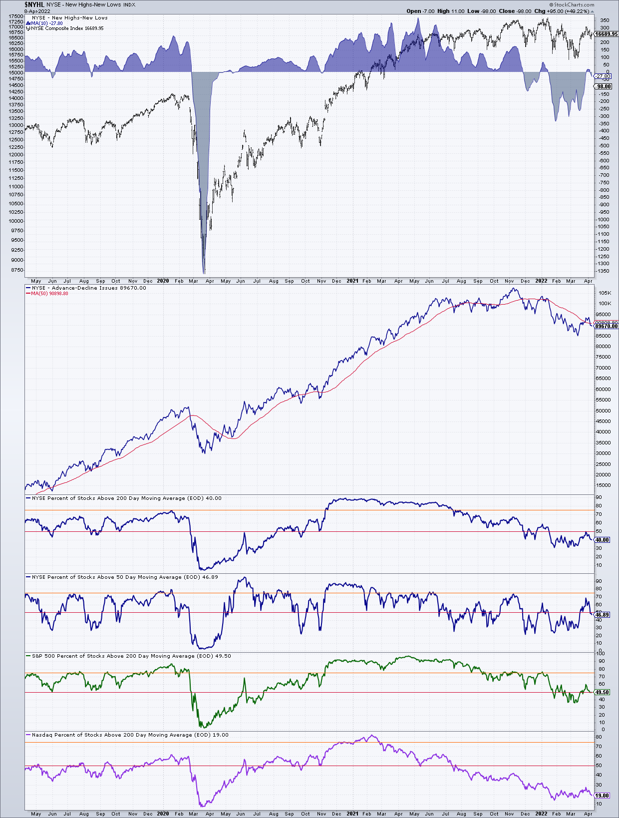 Los nuevos máximos superaron brevemente a los nuevos mínimos pero ya estamos de vuelta a la historia de todo el año, mas nuevos mínimos que máximos, un empeoramiento de la amplitud también del lado de las acciones por arriba de su media de 200, principalmente mas golpeado en el Nasdaq.