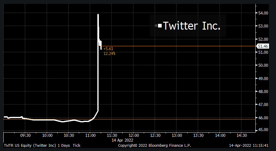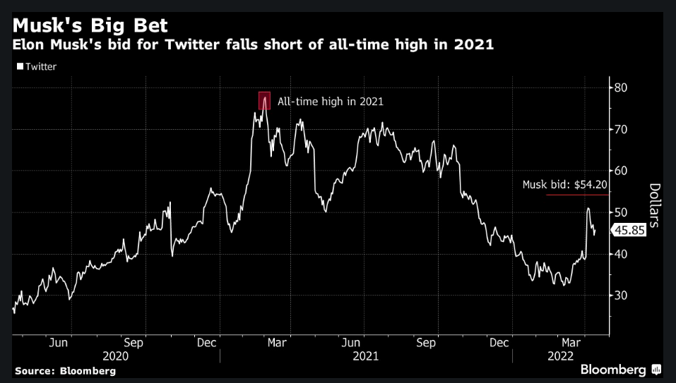 El precio de oferta de Musk de 54,20 dólares por acción, que se reveló en una presentación regulatoria el jueves, representa una prima del 38 % con respecto al cierre de Twitter del 1 de abril.