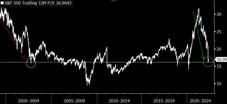 Las valoraciones han trazado el mismo curso de aproximadamente 32x a aproximadamente 16x pero a 3x la velocidad de la burbuja tecnológica. El PE final del S&P500 está aproximadamente al mismo nivel que cuando tocó fondo en 2002.