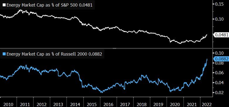 La energía es ahora el 4,8% de la capitalización de mercado del S&P500, todavía muy por debajo de su marca del 13% inmediatamente después de la Gran Crisis Financiera. La energía de pequeña capitalización es el 8,8% del Russell 2000, por encima del máximo del ciclo anterior.