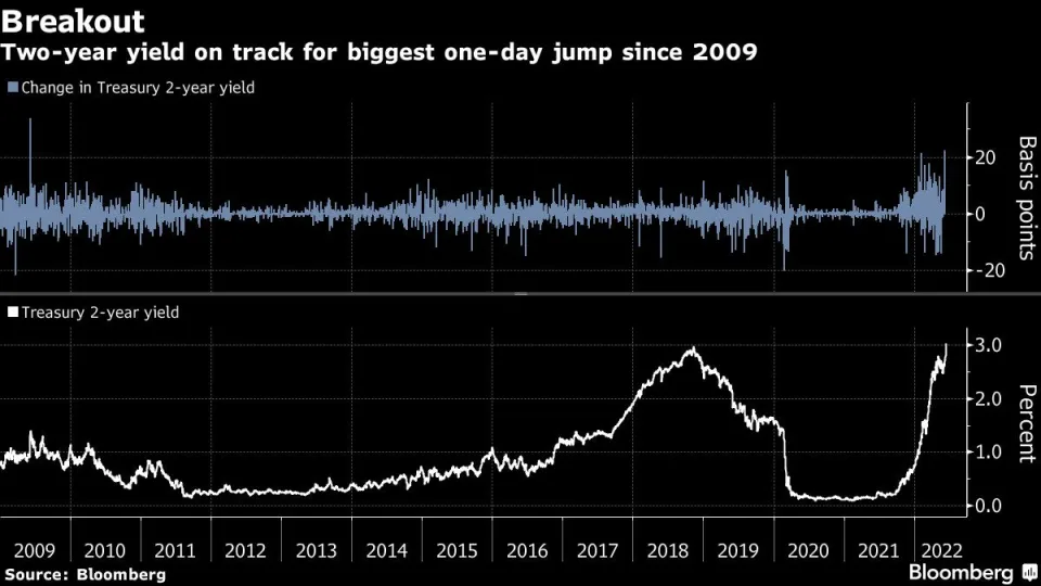 Las expectativas revisadas impulsaron el rendimiento de los bonos del Tesoro a 2 años hasta 26 puntos básicos hasta el 3,07%, el nivel más alto en 14 años. El fuerte movimiento alcista de las tasas cortas dejó los rendimientos a 30 años por debajo de los bonos a 5 años, lo que indica el riesgo de que el endurecimiento del banco central desacelere drásticamente el crecimiento económico o desencadene una recesión.
