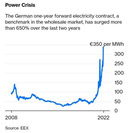 El contrato de electricidad (1y forward) en Alemania, referencia del mercado mayorista, ha subido más de un 650% en los últimos dos años.