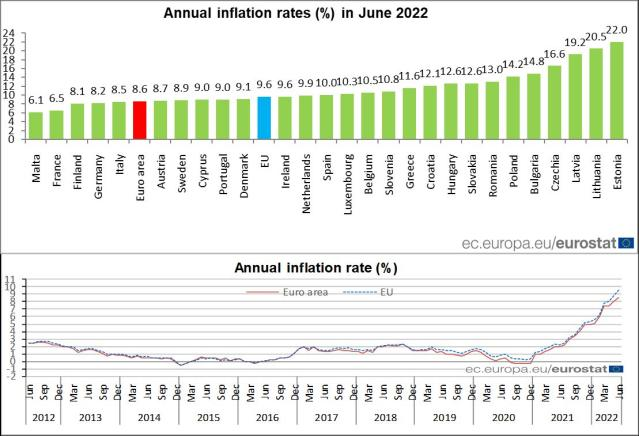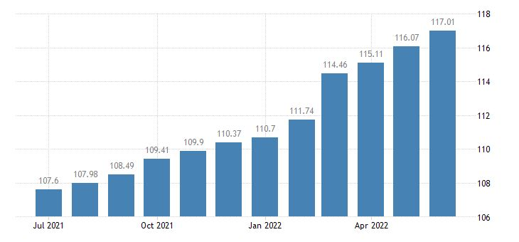 El Índice de Precios al Consumidor IPC en la Eurozona aumentó a 117,01 puntos en junio desde 116,07 puntos en mayo de 2022. #Inflación anual de la zona del euro hasta el 8,6 % en junio