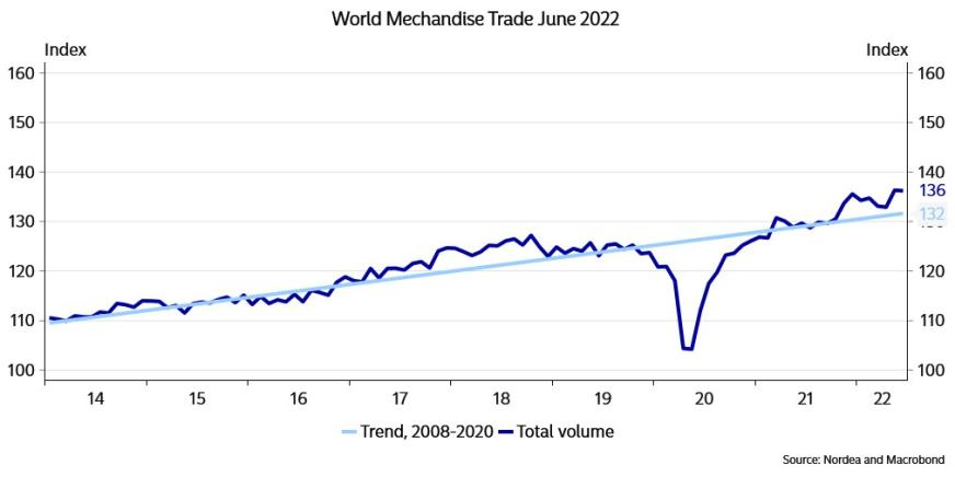 El comercio mundial se estancó en junio y se mantuvo por encima de la trayectoria a largo plazo. En realidad, esta es una buena noticia que indica que algunos de los problemas de suministro global se han suavizado significativamente. El tercer trimestre podría resultar más nefasto a medida que las altas tasas de inflación comiencen a afectar la demanda.