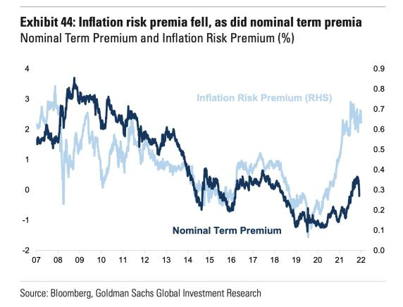 La prima de riesgo de inflación cayó, al igual que la prima de plazo nominal: esto impulsó los activos nominales, como los #bonos, en relación con los activos reales, como las acciones.