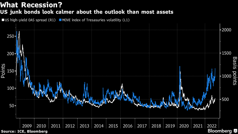 Si bien el índice MOVE se está acercando a los máximos de la era de la pandemia, los diferenciales de los bonos basura aún se mantienen contenidos en alrededor de 500 pb.