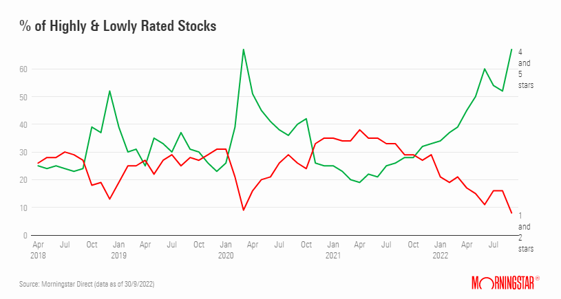 La situación en lo que respecta al porcentaje de valores con 1 o 2 estrellas se parece también mucho a la de marzo del 2020. En aquel momento ese porcentaje llegó al 9%. A final de septiembre el porcentaje se situó en el 8%, es decir, en porcentaje, hubo menos compañías caras en septiembre que en el peor momento de la pandemia, lo que refuerza la idea de que el mercado nunca ha estado tan barato en estos últimos años como ahora.