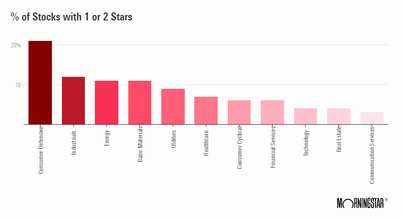 Si analizamos los datos por sectores podemos ver cuáles son los sectores más baratos y más caros como mostramos en los 2 gráficos siguientes. El sector de servicios de comunicación es, por ejemplo, el sector con el porcentaje más alto de valores con 4 y 5 estrellas, mientras que el sector de consumo defensivo es el sector con el mayor porcentaje de compañías con 1 o 2 estrellas. Hay que tener en cuenta que en estos cálculos no se tiene en cuenta la capitalización de mercado, mientras que en los fondos o ETFs sectoriales, las compañías más grandes suelen tener un mayor peso.