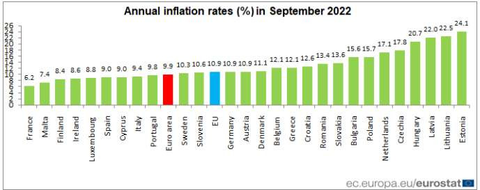 La inflación se acelera menos de lo esperado en el mes de septiembre en la Euro Zona IPC de la Eurozona Interanual Final Actual 9.9% (Pronóstico 10%, Anterior 9.1%)