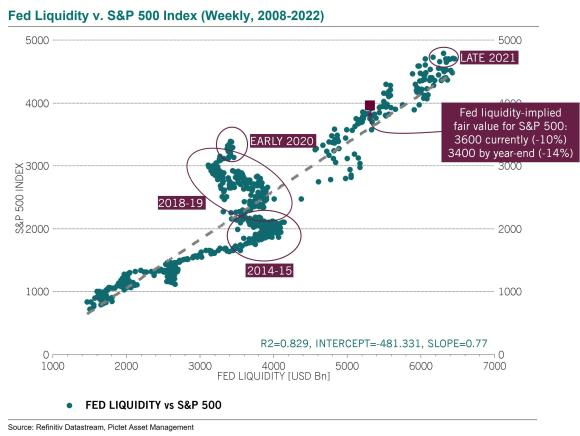 Las acciones de EE. UU. cotizan con una prima del 10 % sobre el valor razonable implícito de liquidez de la Reserva Federal. Y, con $ 95 mil millones por mes QT, el valor razonable cae un 2% cada mes que pasa.