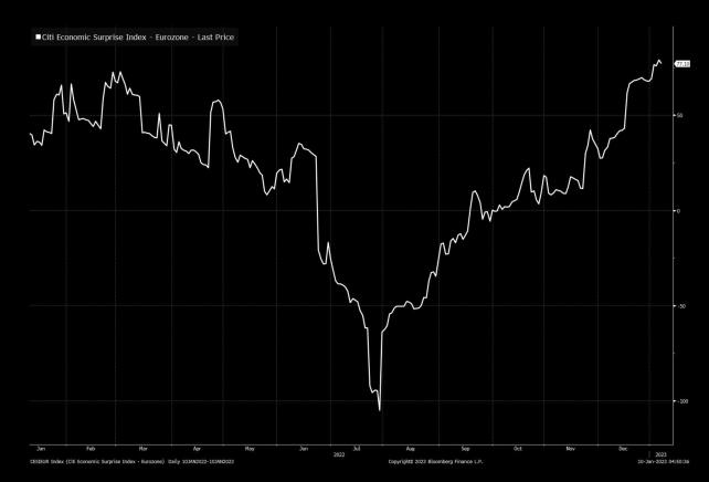 El índice de #sorpresa económica de la #Eurozona de Citi, una medida de qué tan bien están llegando los datos en relación con las expectativas, está en su nivel más alto en más de un año.