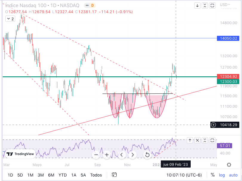 Para nuestra opinión el mercado tras la fuerte subida de inicio de año (5 semanas seguidas) tiene que consolidar y hacer un retroceso lo que sería sano para el mercado, me han llamado bull pero no lo soy, estoy consiente de los riesgos que tenemos macro como una posible recesión, la inflación, el QT , sin embargo hablando técnicamente el mercado solo esta haciendo un pullback a la zona que rompió , la semana que viene es fundamental con el dato del CPI y podemos saber la dirección a seguir, si el mercado se mete nuevamente por debajo podría ser una gran trampa para toros, si el mercado respeta el soporte seguiremos alcistas.