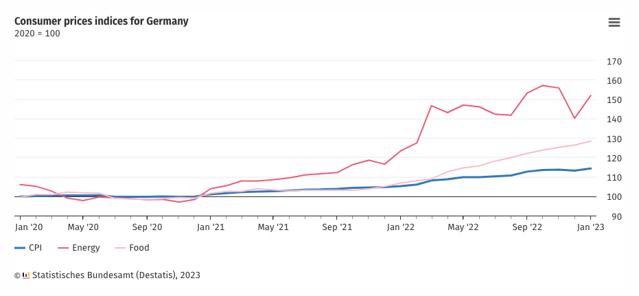 La tasa de inflación en Alemania, medida como la variación interanual del índice de precios al consumidor (IPC), se situó en +8,7 % en enero de 2023. La revisión que introdujo el nuevo año base 2020 resultó en tasas de inflación de +8,1 % para diciembre de 2020 y +8,8% para noviembre de 2020. El aumento de precios se aceleró así a principios de año. “Después de una desaceleración a fines del año pasado, la tasa de inflación se mantiene en un nivel alto”, dice Ruth Brand ., Presidente de la Oficina Federal de Estadística. La Oficina Federal de Estadística (Destatis) también informa que los precios al consumidor en enero de 2023 aumentaron un 1,0% en diciembre de 2022.
