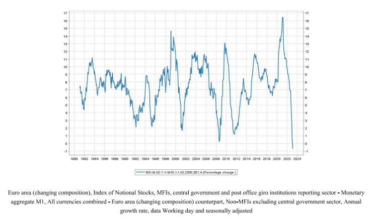 En el zona #euro , la tasa de crecimiento anual del agregado monetario más estrecho M1 (efectivo en circulación + depósitos a la vista) disminuyó a -0,7% en enero desde 0,6% en diciembre