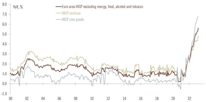La inflación subyacente de la zona del euro aumentó hasta el 5,60 % en febrero, ya que tanto los bienes básicos (6,8 %) como los servicios (4,8 %) alcanzaron nuevos máximos históricos. Hasta que veamos los primeros signos de que la inflación subyacente está llegando a su punto máximo, es poco probable que el BCE reduzca el ritmo de ajuste. Otra subida de 50 pb en mayo está en juego.