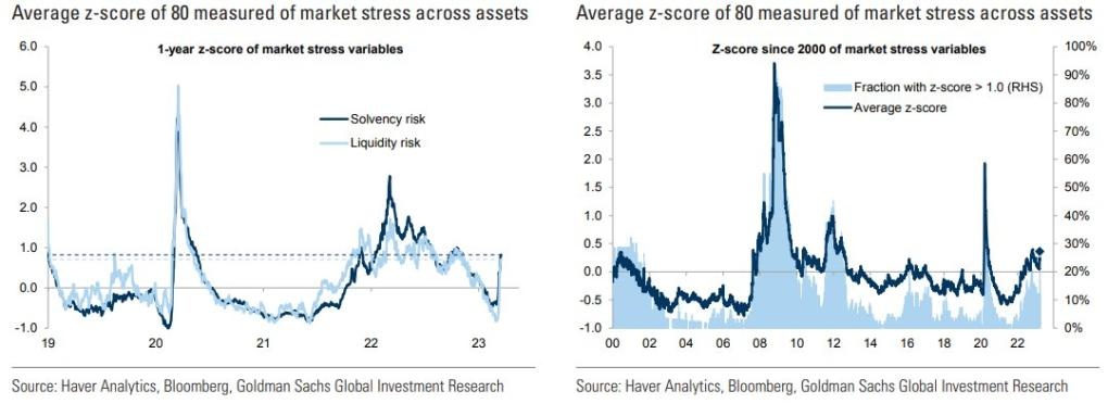 La tensión del mercado ha aumentado en las últimas semanas (gráfico de la izquierda), pero sigue estando muy por debajo de los episodios de crisis anteriores (gráfico de la derecha).
