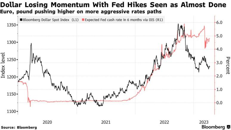 el índice al contado de Bloomberg #Dollar ha caído casi un 10 % desde que alcanzó un máximo histórico en septiembre, ya que #Fed desaceleró su ritmo de subidas de tipos de interés