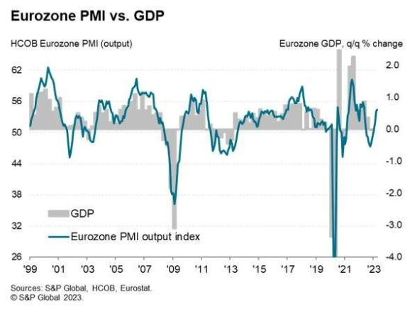 Sexto aumento consecutivo en el PMI compuesto flash para la zona euro, de 53,7 en marzo a 54,4 en abril, un máximo mensual de 11 meses y mejor de lo esperado.