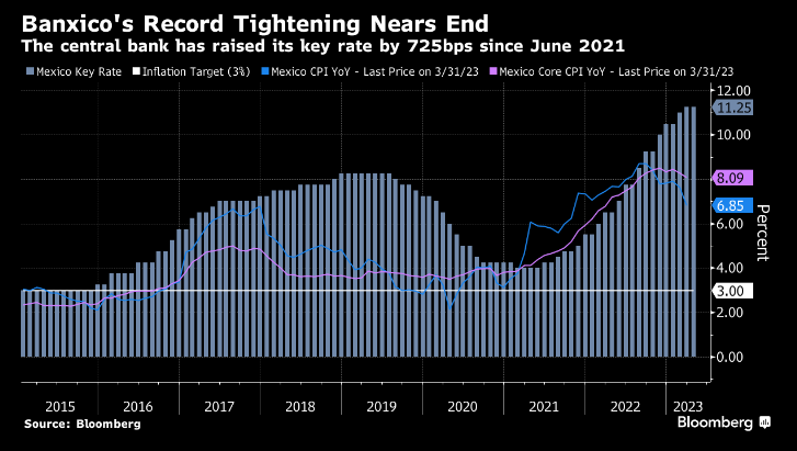 Banxico (Banco Central de México) discutirá detener ciclo de tasas Evalúa en la próxima decisión del 18 de mayo. La inflación se ha desacelerado en México y los swaps de tasas de interés cayeron a mínimos de sesión mientras hablaba hoy la autoridad monetaria. En la última reunión, los gobernadores votaron por unanimidad aumentar las tasas al 11,25%. Y eso es después de que los banqueros sorprendieran al mercado con 50 pb en la reunión anterior. La inflación se desaceleró en abril a 6,24%, por debajo del 6,58% de marzo. México aún podría subir en mayo, pero ha subido 725 pb desde junio de 2021