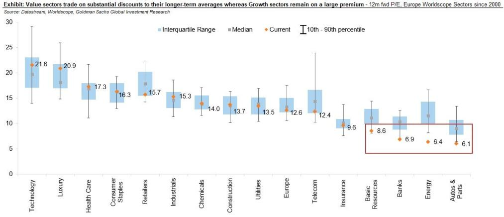 Valoraciones: valor vs crecimiento en Europa desde 2000 El comercio de valor todavía tiene un descuento, mientras que el crecimiento aún tiene una prima a través de P / E a plazo
