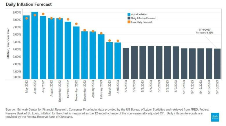 Las caídas mensuales en el #CPI esencialmente se detuvieron en abril, pero se espera que se reanuden en mayo, de acuerdo con la inflación “proyectada ahora” por la fed de Cleveland que utiliza una muestra de precios diarios.