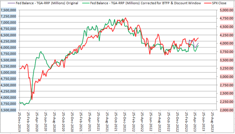 La Fed drenó 46 mil millones, pero TGA agregó 86 B y RRP agregó otros 19 B, por lo que la liquidez aumentó 60 mil millones. (No es de extrañar que sigamos subiendo)