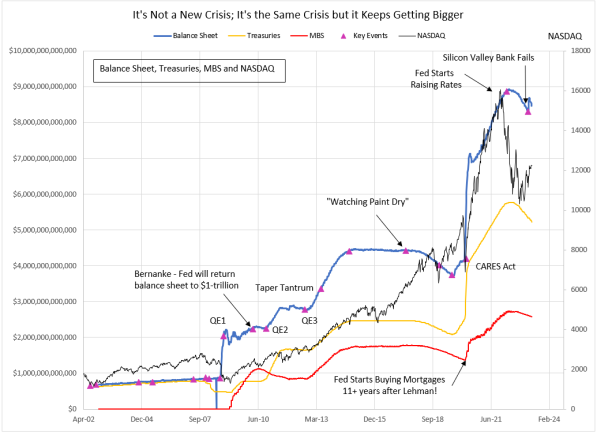 En marzo de 2010, Bernanke le dijo al Congreso que la Fed volvería a tener el balance por debajo de $ 1 billón. En junio de 2017, Yellen dijo que la Fed recortando su hoja de balance sería como “ver cómo se seca la pintura”. Hoy, ¿la Fed dice que puede diseñar un aterrizaje suave y la gente les cree?