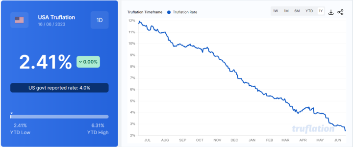 TRUFLATION estima que la inflación disminuyó (-0 0,67 %) MoM a 2,41% para el 16 de junio de 23 (vs 18 de mayo de 23) -> ahora en su nivel más bajo desde junio de 22