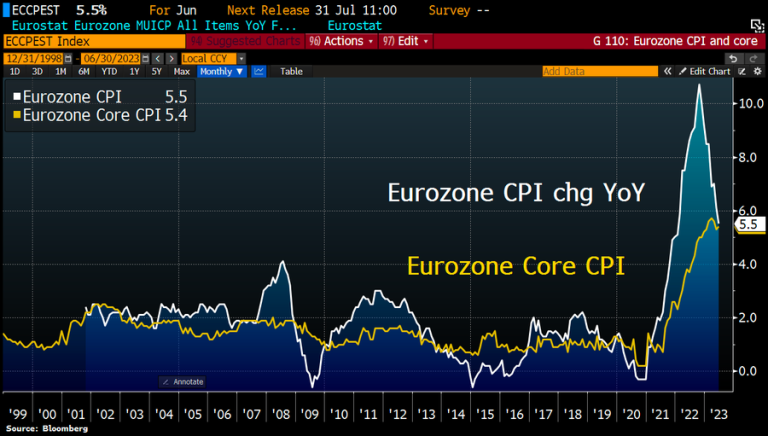 La #inflación de la #eurozona cayó más de lo esperado en junio, ya que los precios de la energía cayeron aún más y la inflación de los precios de los alimentos disminuyó, pero el IPC subyacente sigue subiendo. El IPC se desacelera al 5,5 % interanual en junio desde el 6,1 % de mayo, su tasa más baja desde principios del año pasado, por debajo de las expectativas del 5,6 %. PERO la inflación subyacente de la eurozona subió al 5,4 % en junio desde el 5,3 % de mayo debido a un efecto de base causado por el aniversario de un billete de tren con descuento y gasolina subsidiada ofrecida en Alemania en el verano de 2022, lo que apuntaló la lectura de este año.