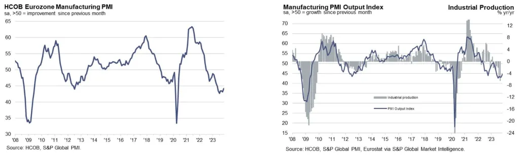 El informe señala algunos signos de moderación en la caída de la producción, los nuevos pedidos y los inventarios, a pesar de que en la eurozona en su conjunto continúa la desaceleración del sector manufacturero.