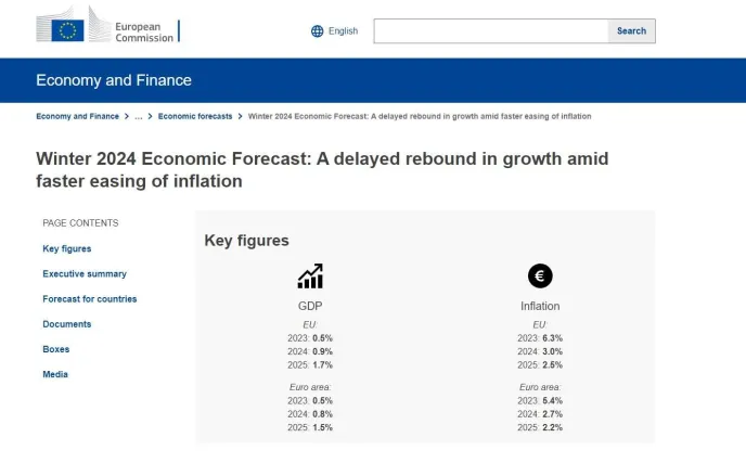La Comisión de la UE recorta el pronóstico de crecimiento del PIB de la eurozona para 2024 al 0,8% desde el 1,2% previsto en noviembre y prevé un crecimiento del 1,5% en 2025.