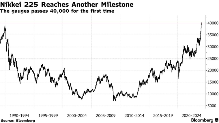 El Nikkei 225 de Japón supera por primera vez el nivel clave de 40.000 puntos Las últimas ganancias siguen al indicador recuperando su pico de 1989 Los inversores globales han estado invirtiendo en acciones japonesas