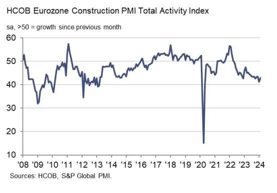 PMI de construcción de la eurozona 42,9 (previsión -, anterior 41,3)