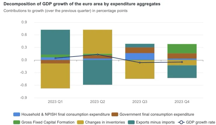 ➡️ PIB: 0% intertrimestral en EA/UE; +0,1%/+0,2% interanual en EA/UE frente al cuarto trimestre de 22