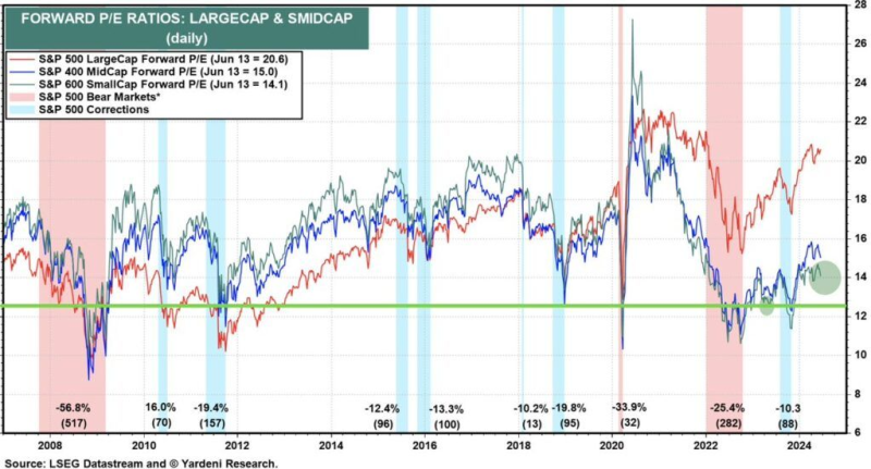 relación P/E futura de las acciones de gran capitalización está cerca del nivel más alto desde el colapso de las puntocom. Sin embargo, el PER a futuro de las acciones de pequeña y mediana capitalización se ha mantenido en sus niveles más bajos en más de diez años. Y lo que es más importante, la valoración actual ha sido la más baja desde 2008, excluyendo los periodos en los que el mercado se encontraba en una corrección