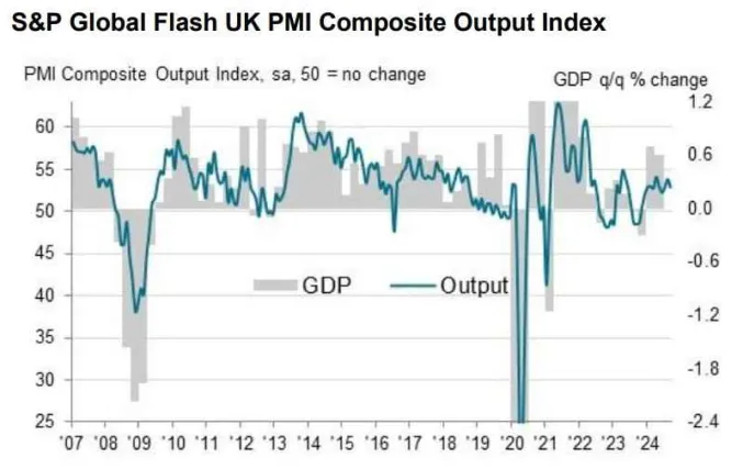 El índice PMI compuesto del Reino Unido cayó a 52,9, por debajo de la previsión de 53,5 y el dato anterior de 53,8. El PMI de servicios también mostró una desaceleración, alcanzando 52,8 (previsión: 53,5; anterior: 53,7), mientras que el PMI manufacturero fue de 51,5, inferior al pronóstico de 52,2 y al 52,5 del mes anterior. Estos datos sugieren una moderación en la actividad económica del Reino Unido, tanto en el sector de servicios como en el manufacturero.